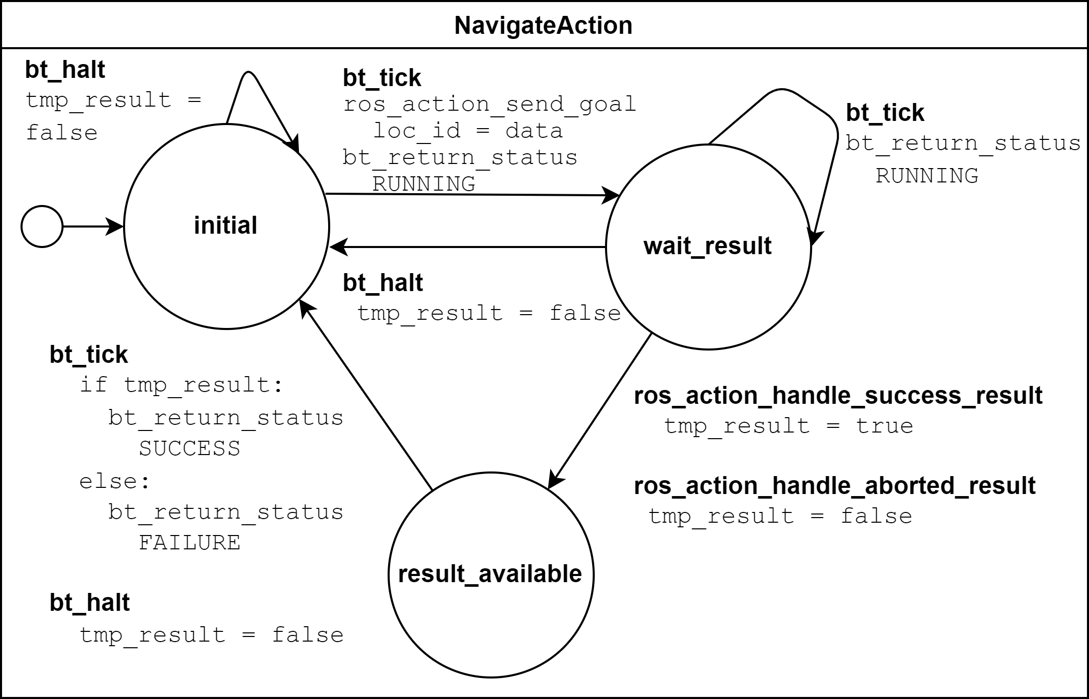 The next image depicts the behavior of the BT plugin bt_navigate_action.scxml. It is used to navigate to a certain location given by the id, either 0 or 1 in this example, stored in data. When the BT is ticked it assigns loc_id = data. When the BT is halted or the action is aborted tmp_result is set to false, otherwise it is set to true. Based on that the return status of the tree is then published.