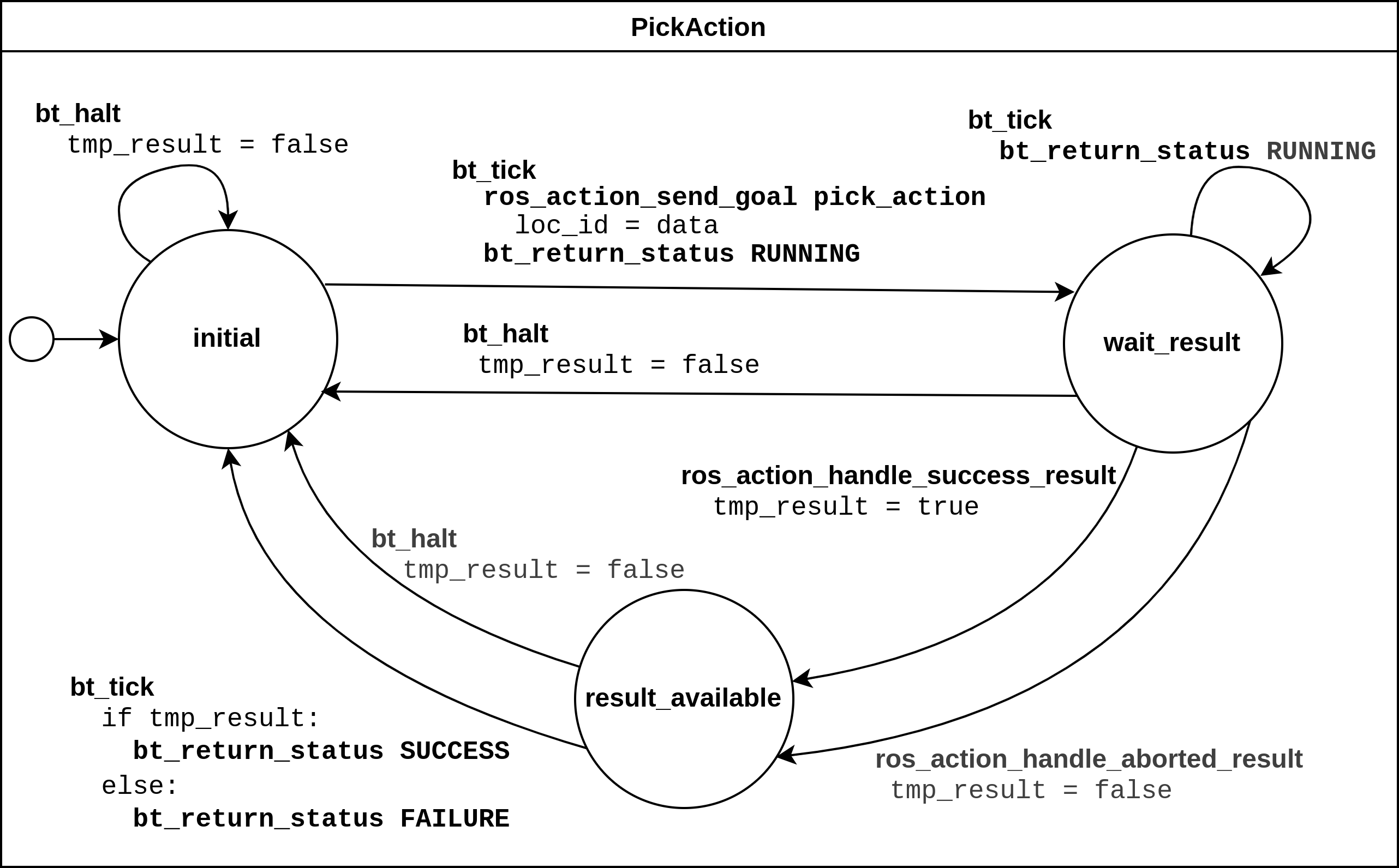 The next image depicts the behavior of the BT plugin bt_pick_action.scxml in a very similar fashion. The action is used to pick a certain item with a given id, stored in data. When the BT is ticked it assigns object_id = data. When the BT is halted or the action is aborted tmp_result is set to false, otherwise it is set to true. Based on that the return status of the tree is then published.